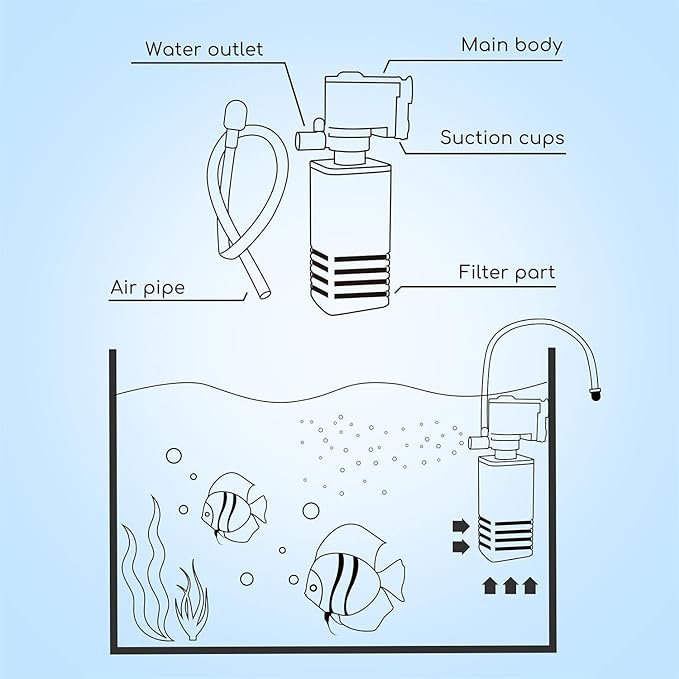 - 【Crystal Clear】 Reducing the number of times the fish tank needs to be changed. Aquarium air pump, filtration, water pump, and water waves making all in one multi-functional underwater aquarium filter.